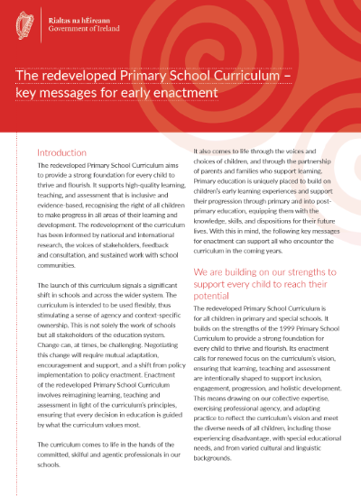 To support its introduction, a set of key messages for enactment has been developed to guide everyone engaging with the curriculum in the years ahead. These messages are grounded in research and shaped through collaboration with teachers, school leaders, and colleagues across the Department of Education and Youth, the Inspectorate, the National Council for Curriculum and Assessment, the National Council for Special Education, and Oide.
